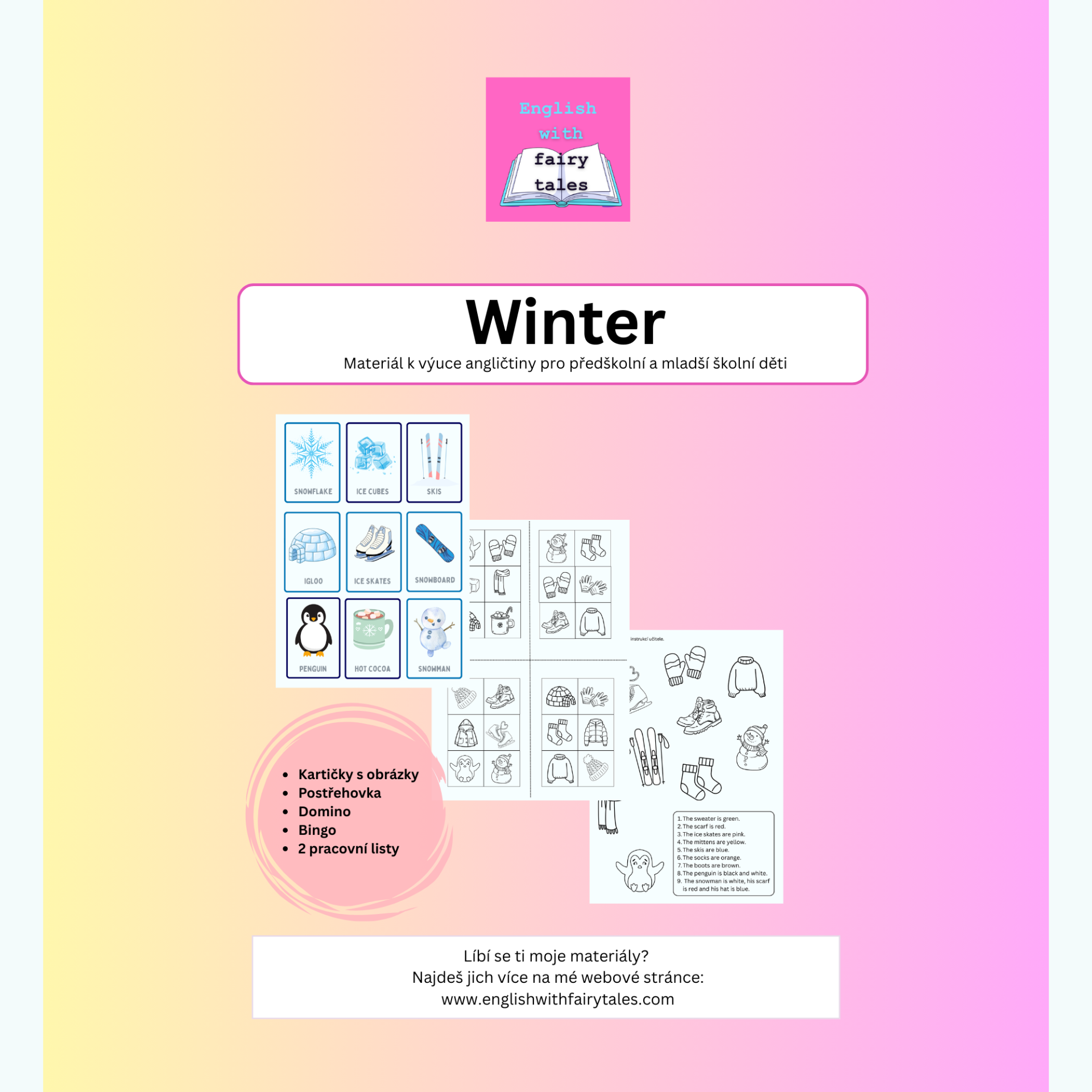 Materiál slouží k výuce angličtiny pro děti předškolního věku a mladší děti školního věku (do 2.třídy). Materiál pomáhá k hravému učení angličtiny s obrázky.